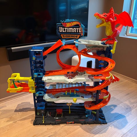 Hot Wheels lekesett med bilbane i fargerik plast. Inkluderer flere etasjer og ramper for bilkjøring. Passer for barn som liker bilbaner og lek med biler.