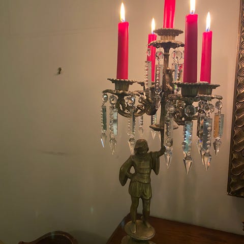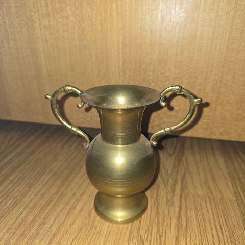 Messing kandelaber med fem armer. Laget i messingmateriale med rund base og dekorative detaljer. Egnet for plassering på bord eller hylle for å holde opptil fem lys.