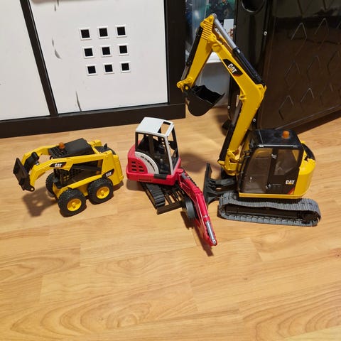 Stor Bruder hjullaster i gul og svart plast. Bevegelig graveskuff. Ca 33 cm i lengde