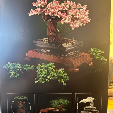Bonsaitre selges ferdig bygget. Eske følger ikke med.