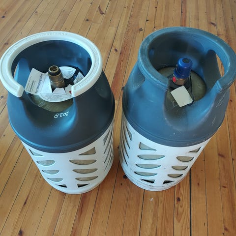 AGA Propan gassflaske med kapasitet på 11 kg. 3 stk, to kompositt og en i metall. Ene i kompositt, er full. Kom med bud. Må hentes. Setter 700kr pr stk, men bud vurderes