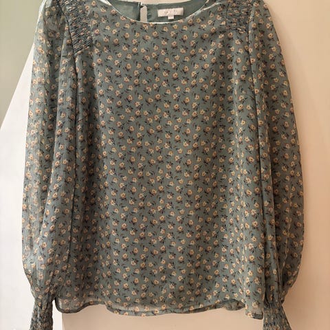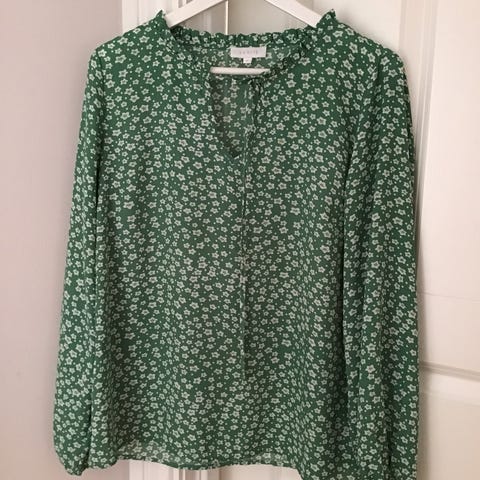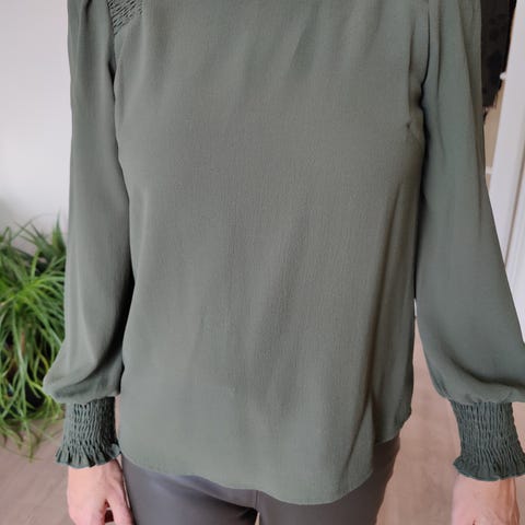 Va Vite Bluse i størrelse M, grønn farge og laget av viskose. Blusen har lange ermer og knappelukking foran.kan sendes mot porto