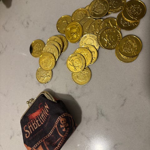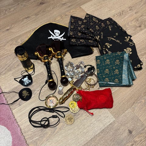 Kapteinsabeltann sverd, flagg, øyelapper, øredobber og figur med lyd.
