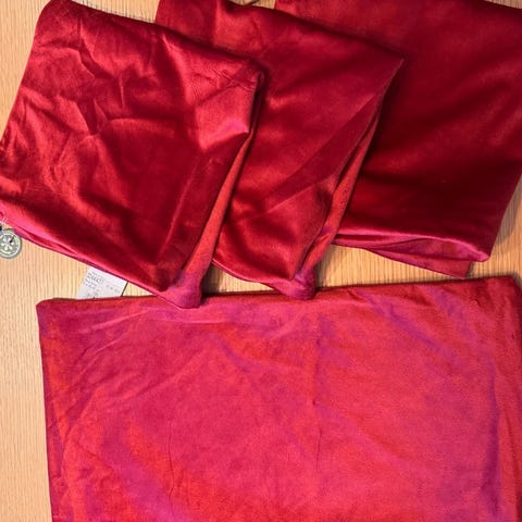 5 putetrekk str 43x43 cm, rød velour forside og beige bomull bakside (bilde 1 og 2)