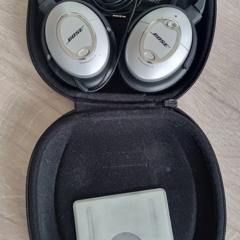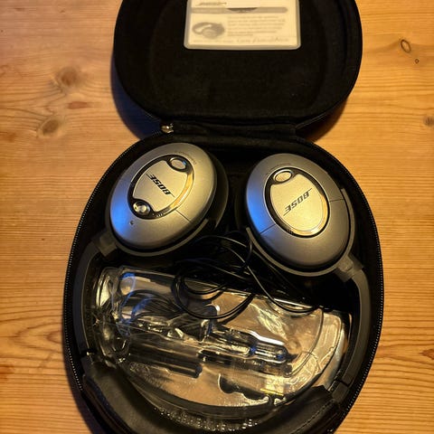 Bose QuietComfort 15 hodetelefoner over-ear med analog støydemping. Følger med et etui for oppbevaring. 3.5mm kontakt er litt slitt, så den er tapet over (se bilde).