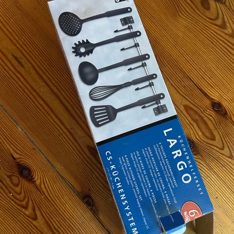 En ballongvisp, en vanlig visp, en kaffeskje, en øse, en kakespade i stål, en stekespade og tre plastsleiver. Alle er pent og lite brukt. Selges samlet for 40kr.
