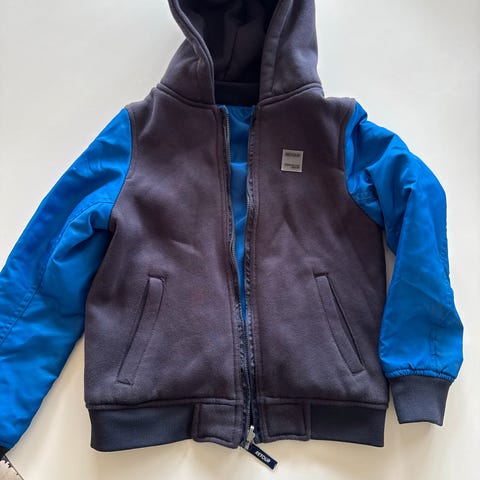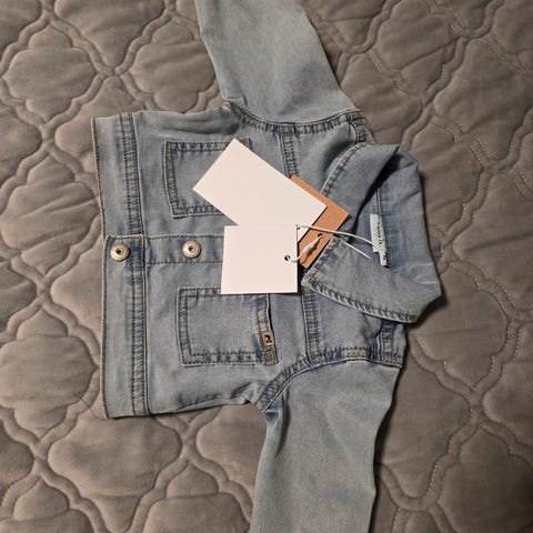Er en str xs-s voksen dame,men passer vel egentlig barn også siden skal være litt stor denimjakke.