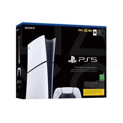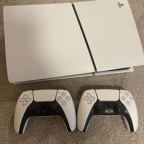Hvit PlayStation 5 digital, selger med 2 kontrollere.