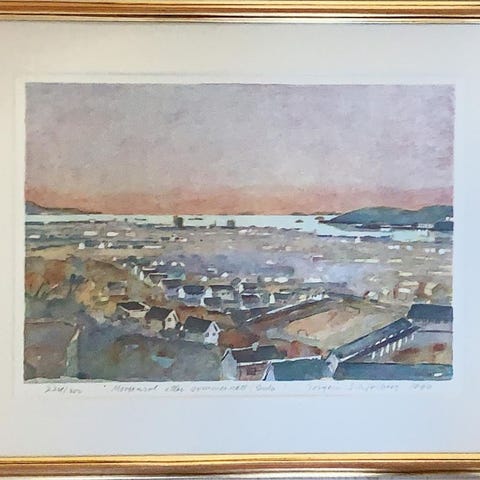 Kvalitets eikramme (3-4 cm bred), krem passepartout, størrelse 32x28cm målt, glass ren og intakt – klar til vegg!