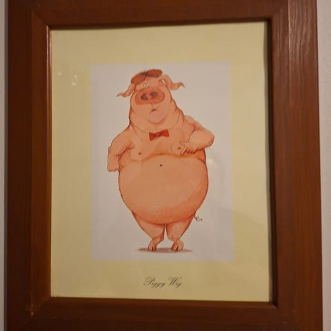 Søkeord Pig Headed kunsttrykk gris maske hue humor eikramme tykk gris smilende pose gul bakgrunn vintage retro barnerom kjøkken dekor 28cm passepartout krem glass perfekt stand Eiken Hægebostad Agder thrift antikk kunst Posten røkfri dyrefritt håndtak henging eik treverk kremfarge grisemotiv quirky norsk humor veggkunst rammet bilde pigart headed maske kunstnerisk leken dekor gulmotiv posering