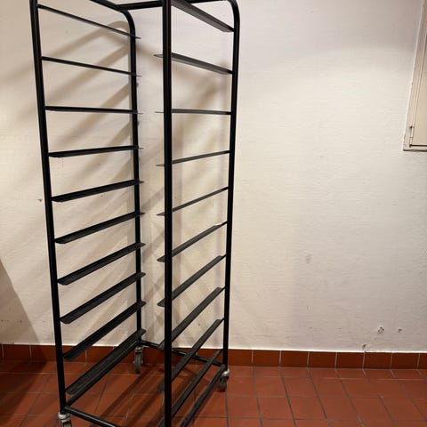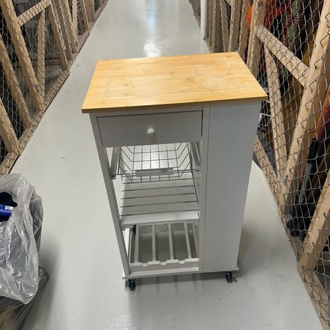 Laget av grågrønn metallramme og treplate på toppen. Vognen har tre nivåer for oppbevaring og er utstyrt med hjul for enkel flytting.