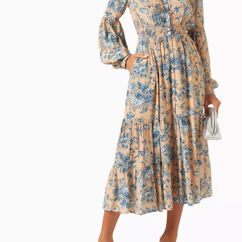 byTiMo Hverdagskjole i størrelse s farge beige, laget av bomull. Kjolen har lange ermer med voluminøse detaljer og et mønster med palmer og naturmotiv. Den har krage og knappelukking foran, samt en innsvingt midje som gir fasong.aldri blitt brukt