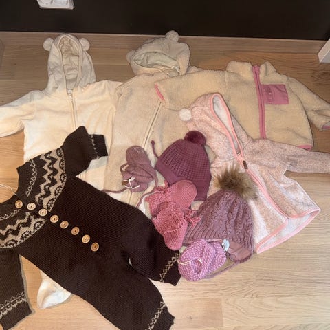 Ullbody og bukse fra Reflex. Noe nupper men mye bruk igjen. To bukser fra Name it. 100% saueskinnstøfler til baby i lys grå. Alt i str 74