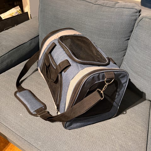 Nesten ubrukt transport sekk/veske til liten hund eller katt. Behagelig å bære på ryggen.