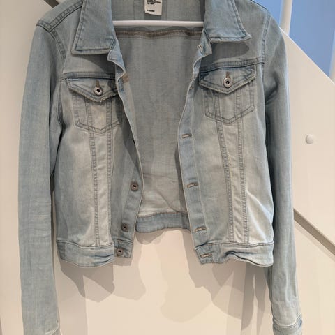 Selger denne pent brukte jeansjakken i str. 34🌸 Lys denim farge og to lommer✨