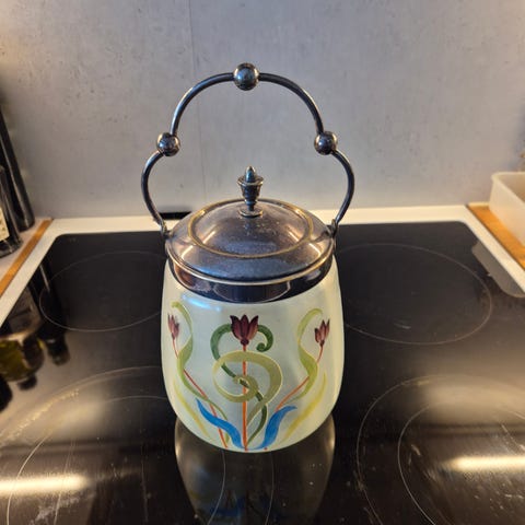 Vintage skål med metall kant og hank. Skålen er håndmalt. H ca 8 cm, B ca 18 cm.