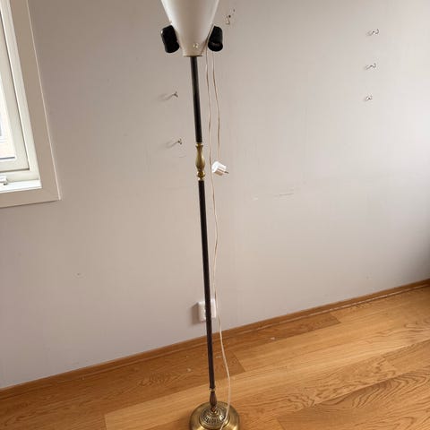 Selger en solid og stilren gulvlampe i messingfinish. Lampen har både uplight og justerbart leselys, hver med egen bryter/dimmer. Gir godt stemningslys samtidig som den fungerer perfekt ved sofa eller lenestol.
