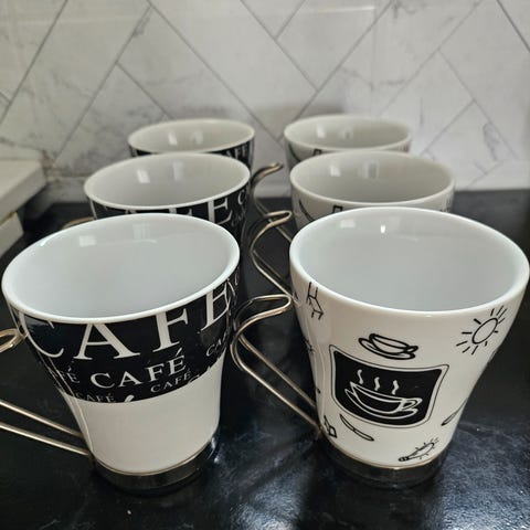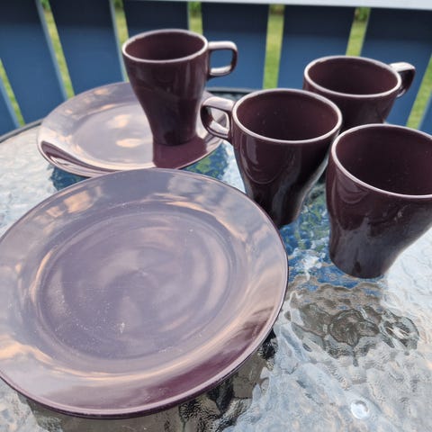 IKEA kopp og tallerken sett i svart farge. Settet inkluderer kopper og tallerkener laget for daglig bruk i kjøkkenet.