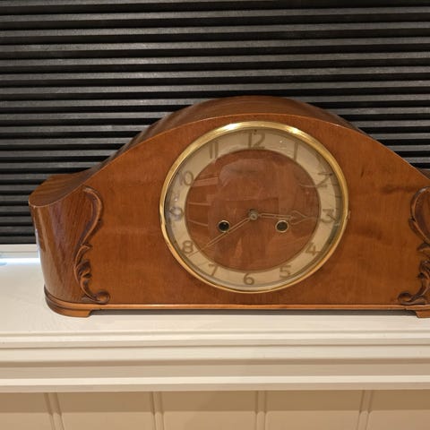 Antikk bordur i originalt, lakkert treverk og messingring rundt urskive. Dateres til ca. 1900. Klokken har mekanisk urverk med nøkkel for opptrekking. Designet har dekorativ form og en rund urskive med nydelig dekor. Passer som tidtaker og dekorasjon i hjemmet.Hyllen klokka står på kan kjøpes ved forespørsel. Det kan legges inn bud på pris og selges til høystbydende.
