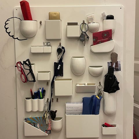 Gult skab har 3 trådkurve i skabet og to skuffer under.