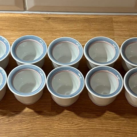 10 eggeglass, fin og skarp i fargen. Kan medfølge gratis 4 eggeglass med mindre skår (14 til sammen) Selges samlet. Kan hentes i Bergen. Åpen for bud.