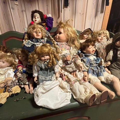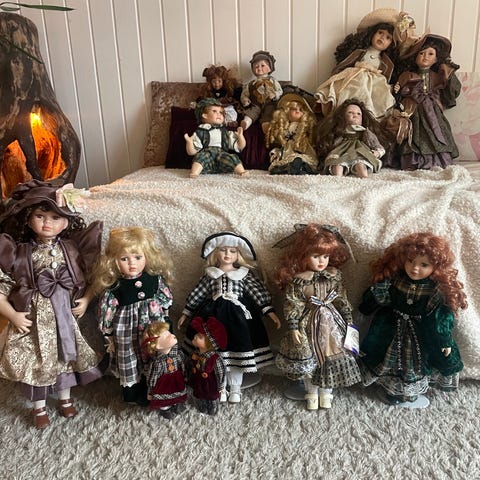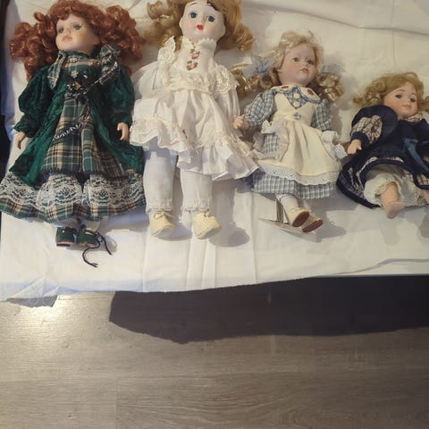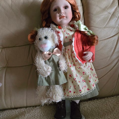 Dukke 1 - porselensdukke med briller og bamse. Hennes høyde er 40/41 cm .
