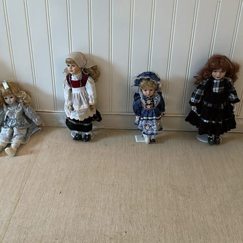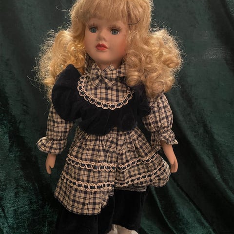 Dukke 2- porselensdukke med rutete kjole og hatt. Hennes høyde er ca 38 cm.