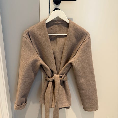 Lekker kremhvit kåpe med høy hals, små skulderputer, splitt bak og trykk knapper i gull. Noen bruksmerker som vist på bilde.