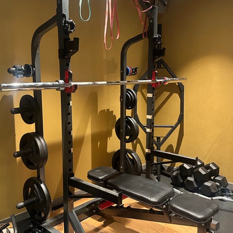 Dønn solid half rack i kommersiell standard vurderes solgt, racket ble kjøpt i 2025 og fremstår som svært pent brukt. Ekstra utstyr som spotter arms, dip attachment og 8 stk vektskiveholdere følger med.