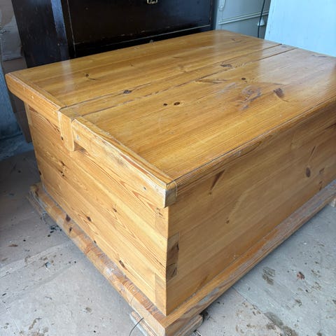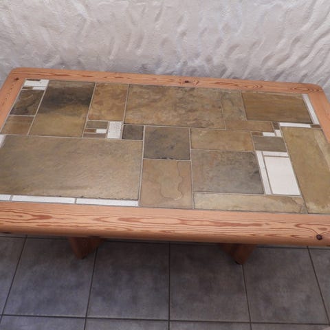 Salongbord laget i heltre furu med naturlig trefinish. Bordet har en rektangulær form med avrundede hjørner og en solid base med plass til oppbevaring under bordplaten.
