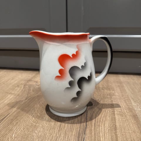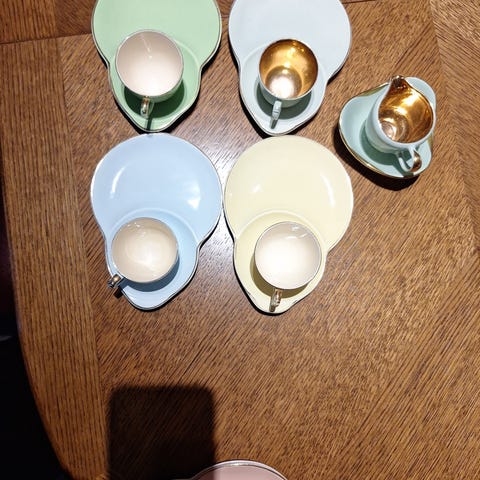 Flott retroservise i klare blåfarger. Seks kuverter med asjett, skål og kopp. Diameter asjetter er 16,5 cm, diameter kopp er 8,5 cm. Én kopp har skår, og asjettene og skålene har krakkelert overflateglasur som ikke synes veldig godt. Koppene er ikke krakkelert. Se to siste bilder. Selges samlet. Kan sendes med PostNord for kr 129,-.