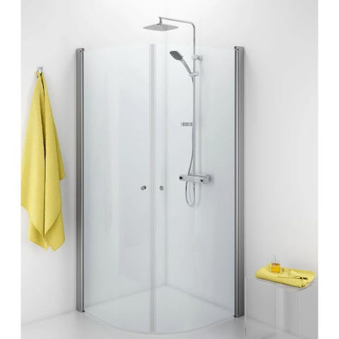 Dusjhjørne med glassvegger og integrert dusjpanel. Inkluderer flere dusjdyser og hånddusj. Passer til hjørneinstallasjon i baderom. Materialer inkluderer glass og metall.