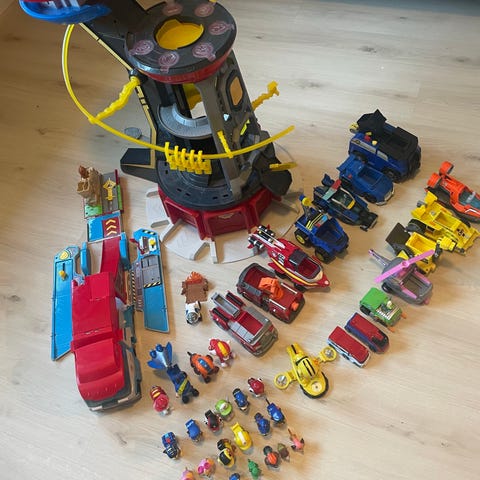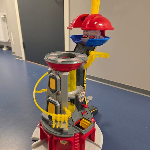 Flott utkikkstårn fra Paw Patrol. Den gule som valpene kan skli på er knekt. Har delene så den kan eventuelt limes. Ellers fungerer alt som det skal. Valpene og Ryder følger med.