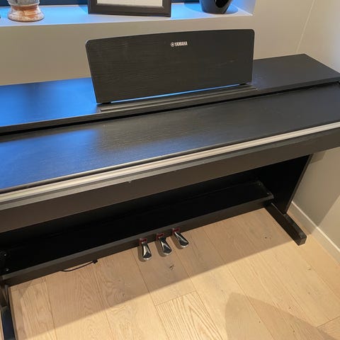 Yamaha P-200 digital piano med 88 tangenter. Instrumentet har innebygde høyttalere, flere lydinnstillinger, og et LCD-display for enkel navigasjon.