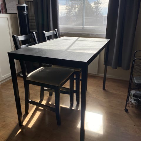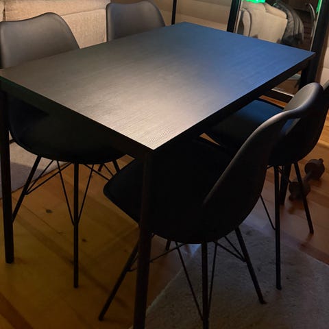 Sort pent brukt spisebord med plass til 4 stoler rundt eller 1 stor kontorstol.