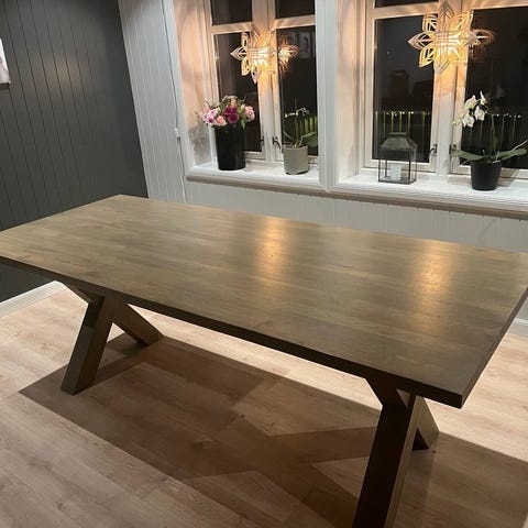 Fått sydd 100% lin duk til bordet som kan kjøpes for 1000 kr i tillegg. Stoffet alene kostet over 2000 kr.