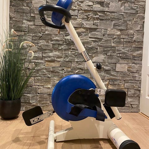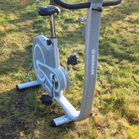 Reck Motomed Mini treningssykkel med digitalt display, pedalstropper og justerbar motstand. Egnet for hjemmebruk til rehabilitering og trening av benmuskulatur.