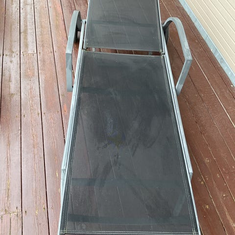 Sammenleggbar solstol med hvit tekstilsete og ryggstøtte, samt svarte armlener og ramme. Designet for utendørs bruk med justerbar liggestilling. Materiale i tekstil og metall. Noe merker da den har stått ute i sommer perioden.