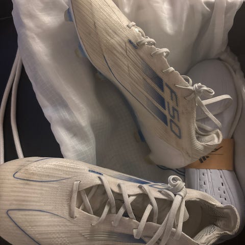 Adidas F50 Adizero fotballsko i blå og rød farge, størrelse 35. Skoene har knotter under sålen for bruk på gressbaner. Blå og svart har ikke knotter. Selges samla for 30 kr.