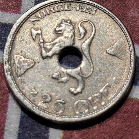 Stor sølvmynt (14 gram), Sølvinnhold 40 % (Sølvvekt 5,6 gram). Sølvverdi pr. 29.01.2026: Kr 195,-