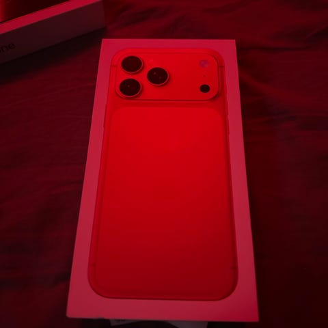 Apple iPhone 17 Pro mobiltelefon med 256 GB lagringskapasitet. Enheten har et oransje deksel og leveres med tilbehør som ladekabel.