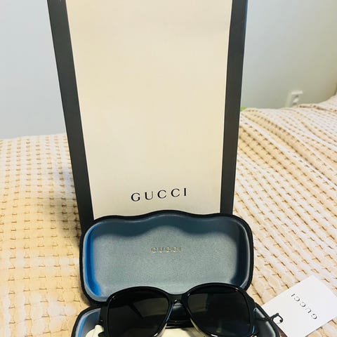 Gucci Dame solbriller i svart farge. Brillene har et smalt, ovalt design med dekorative gullfargede detaljer på sidene.