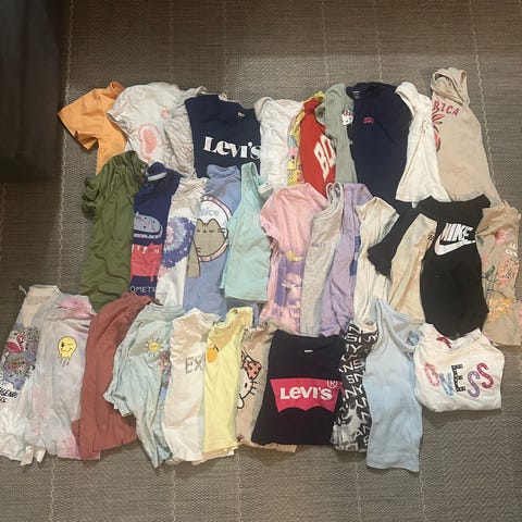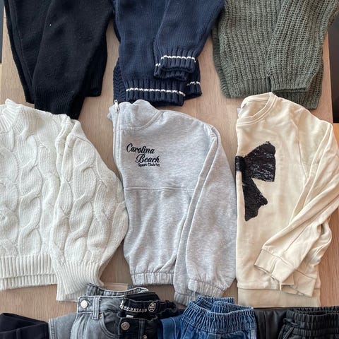 Klespakke til jente fra størrelse 134/140 og 146/152. Mye pent brukt og et par plagg er ubrukt og med lapp på. Noen bruksmerker på noen av plaggene og den rosa blusen mangler knyting til knappen i nakken.
