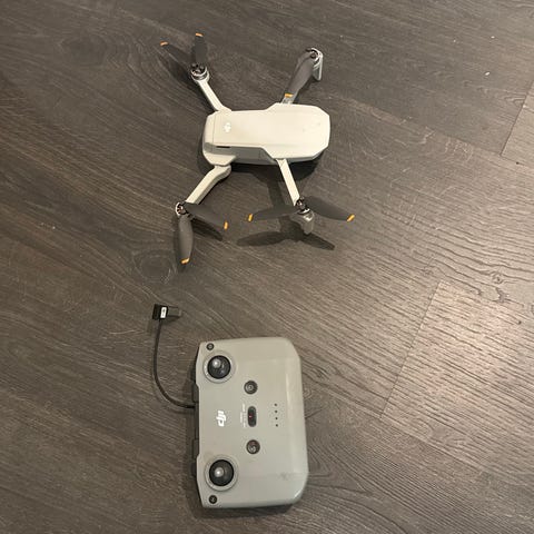 DJI Mini 2 drone med fjernkontroll. Dronen er kompakt og bærbar med fire propeller og en innebygd kameraenhet. Fjernkontrollen har to joysticker og flere funksjonsknapper for styring av dronen.