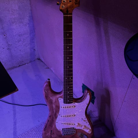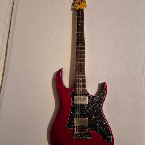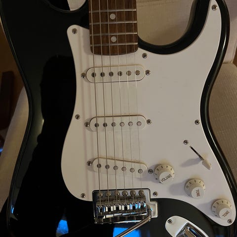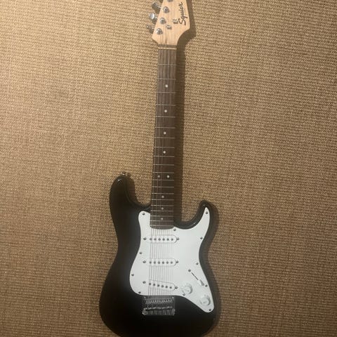 Squier elektrisk gitar i hvit farge. Har tre single-coil pickuper og en humbucker pickup, samt justerbare knotter for volum og tone. Gitaren har tremolo-bro og seks stemmeskruer på hodet. Leveres med svart gitarbag og rosa gitarreim.