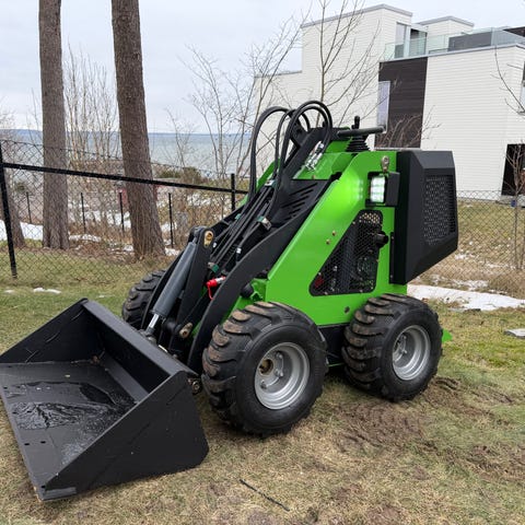 Infront Minilaster / kompaktlaster kompakt maskin med belter. Maskinen har kontrollpanel med joystickstyring og flere indikatorer for driftstilstand. Egnet for bruk i trange områder og på underlag hvor belter gir bedre fremkommelighet enn hjul.