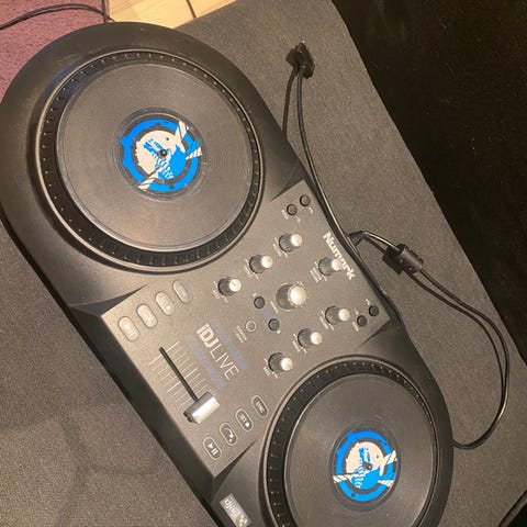 Numark Mixtrack Pro DJ-kontroller i svart farge. Utstyrt med to store jog-hjul, flere faderkontroller og justeringsknapper for lydnivå og equalizer. Passer for DJ-bruk med funksjoner for miksing og lydkontroll.