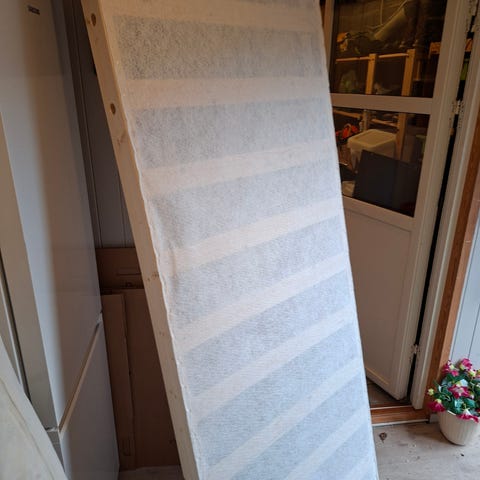 Godt brukt rammemadrass fra Ikea gis bort uten overmadrass. Den har slitasje på siden som vi har løst med å ha denne siden inn mot veggen. Madrassen har også nupper, da vi har hatt overmadrass på. Rammemadrass på bilde 2 + fire ben er inkludert.
