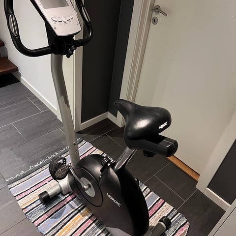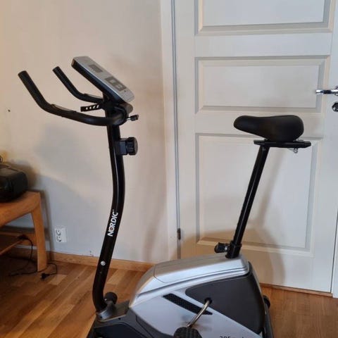 Nordic Trim Sykling Treningssykkel med digital skjerm som viser tid, hastighet, distanse og kaloriforbruk. Utstyrt med justerbart sete og håndtak for komfort under trening.