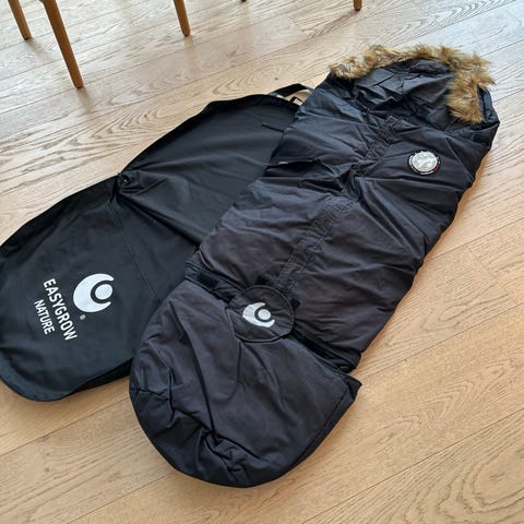 Pent brukt Easygrow Nature vinter vognpose selges. Blågrå utenpå og sort inni. Tykk og god pose som passer for senhøst og vinter. Åpninger for fempunktssele, solid glidelås og lomme foran.